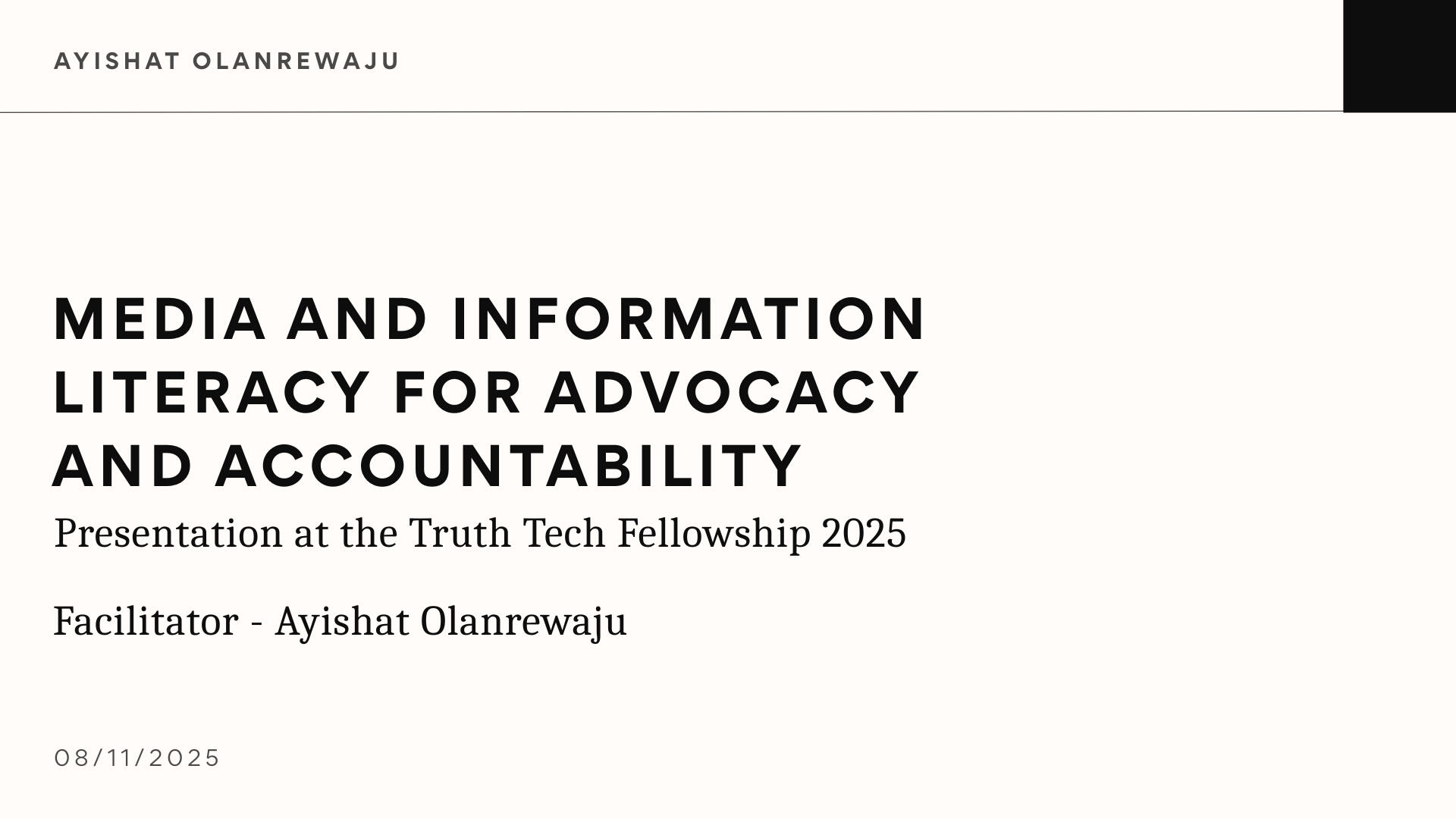 How can media and information literacy (MIL) facilitate advocacy and accountability? I explored this during my session at the 2025 Truth Tech Fellowship, where I discussed Media and Information Literacy for Advocacy and Accountability. The session took place online on the 8th of November 2025